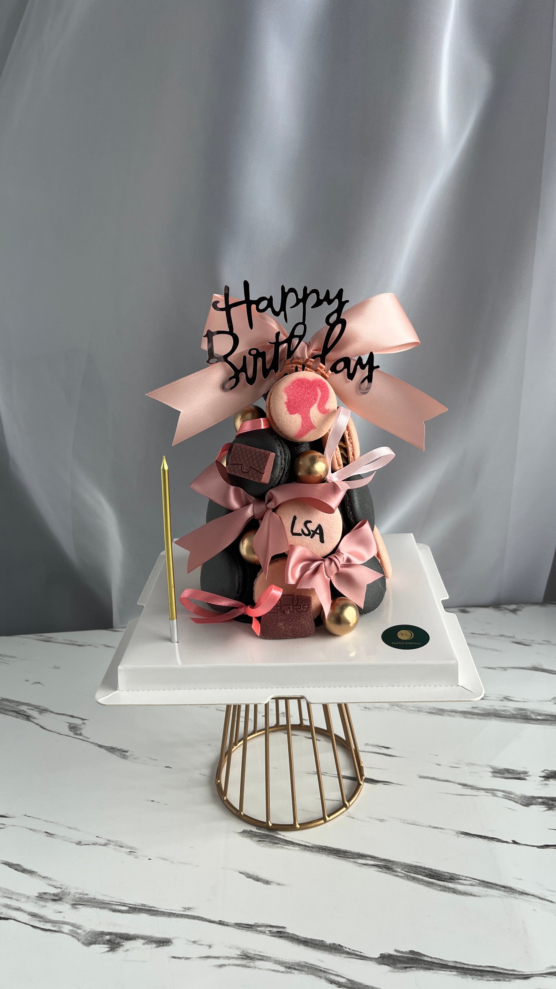 Note: Macarons are affixed with chocolate to prevent them from falling off. They will detach when you peel them off the tower.