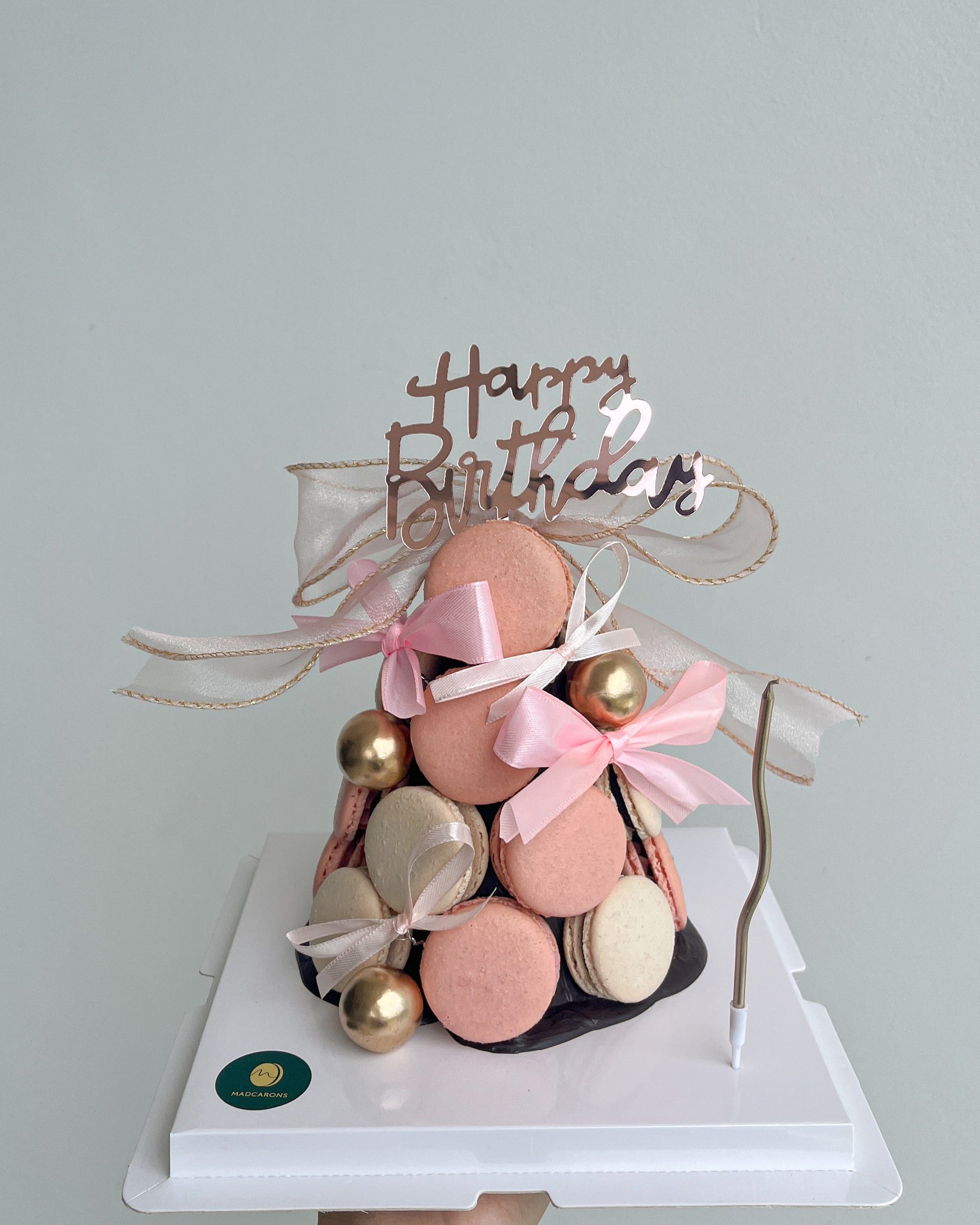 Note: Macarons are affixed with chocolate to prevent them from falling off. They will detach when you peel them off the tower.