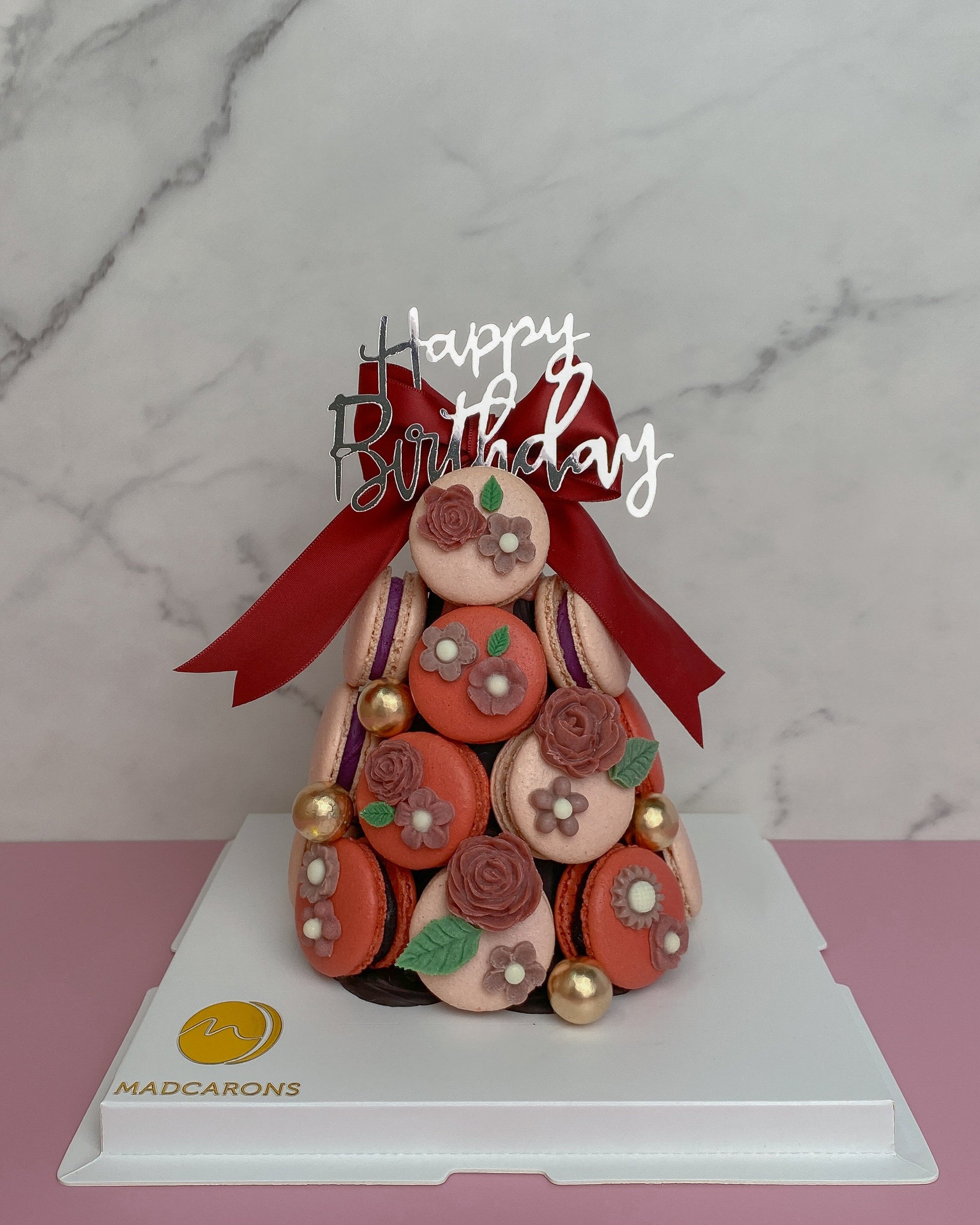 - Front facing side Macarons are decorated with 2D chocolate flowers