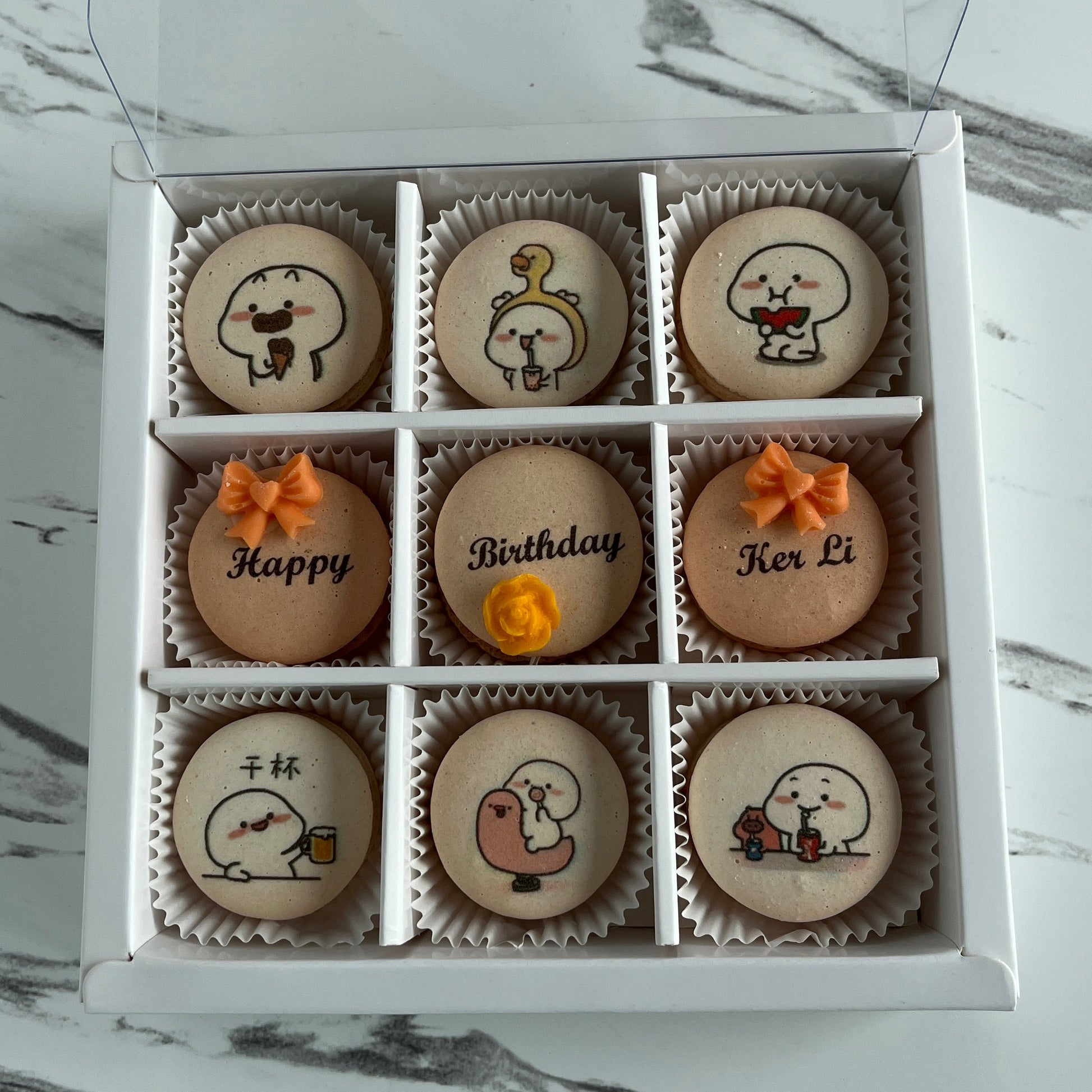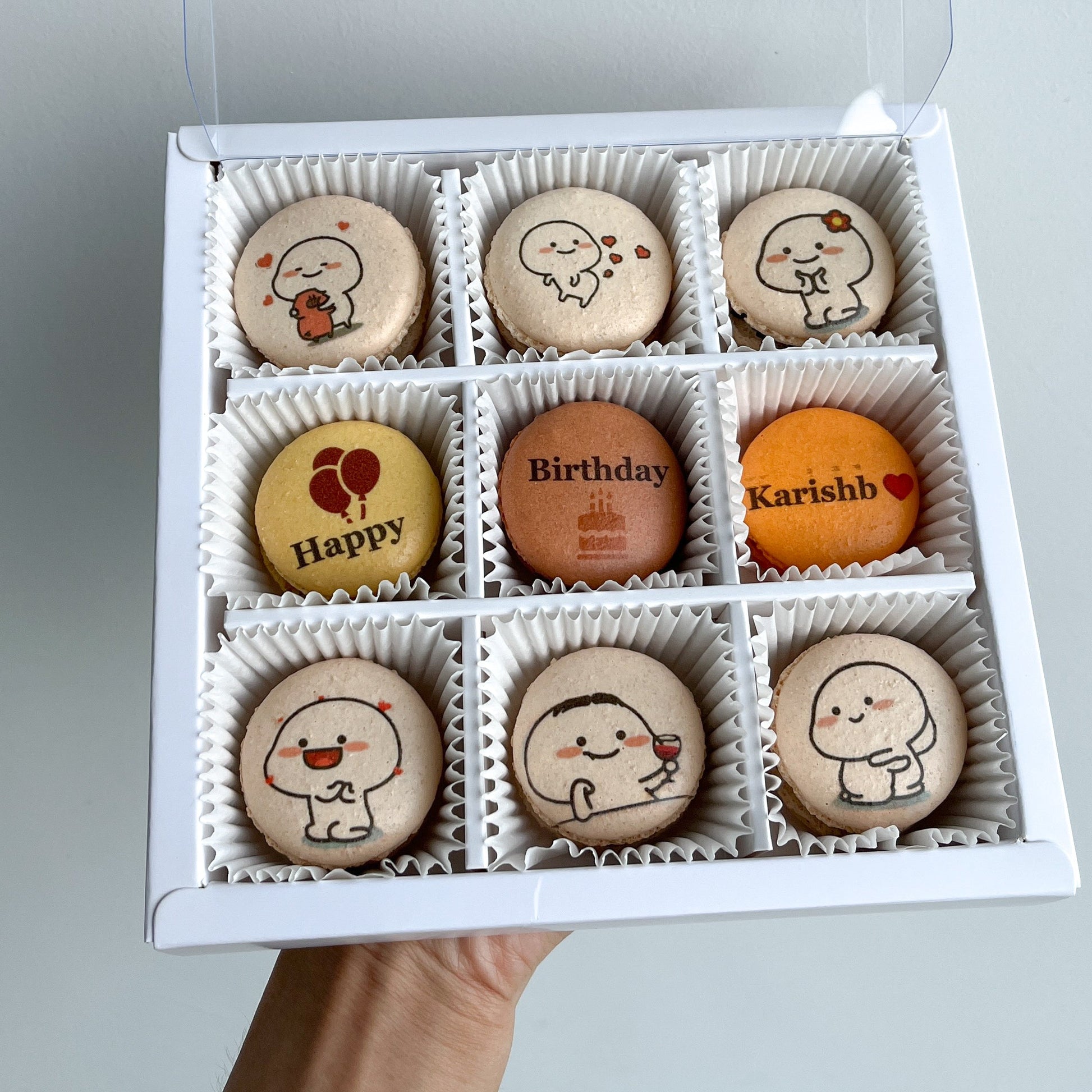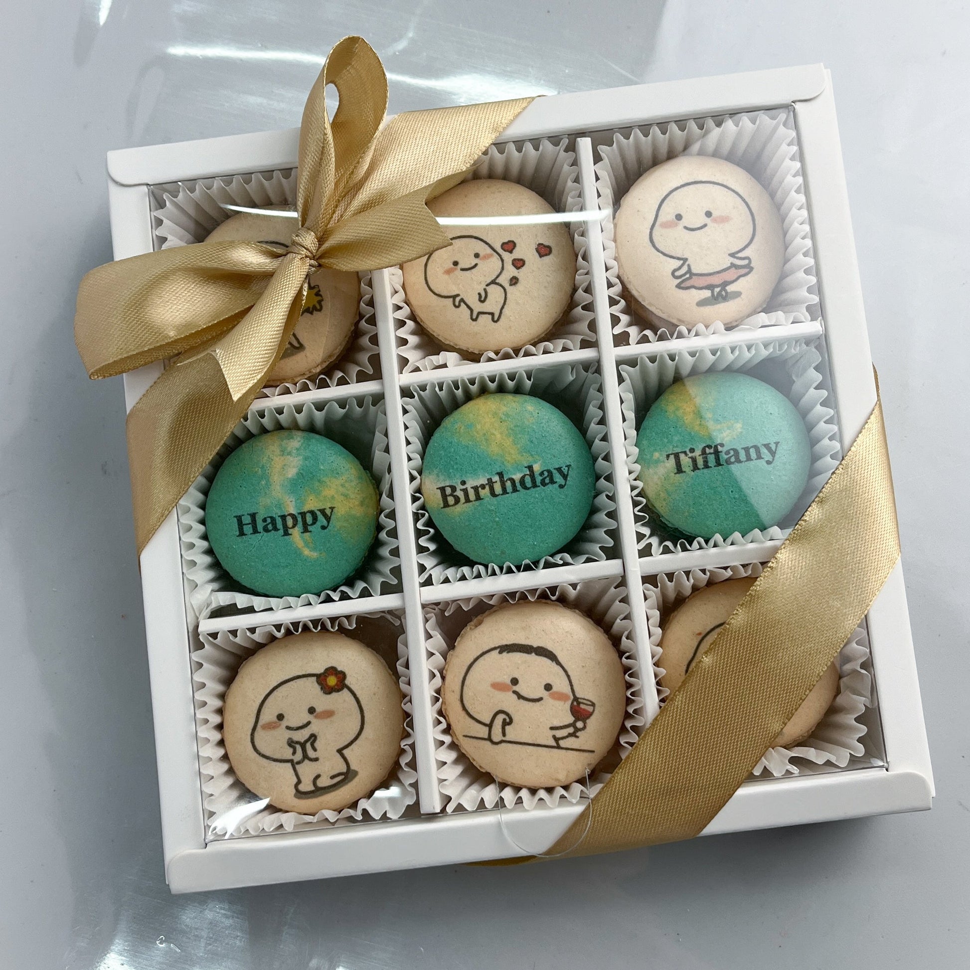 Middle - left blank for us to apply customisable words. Send us the words that you want us to write on the macarons!